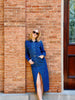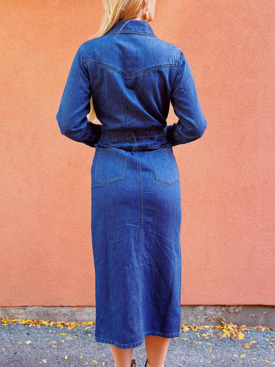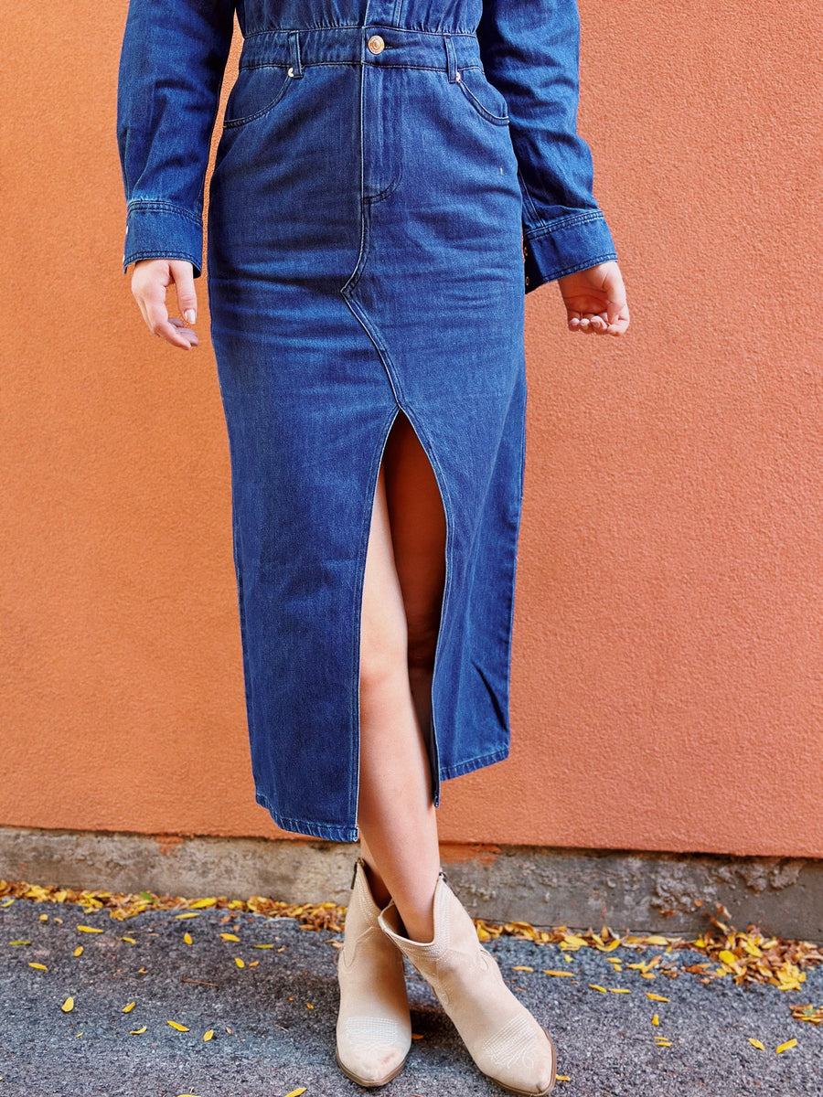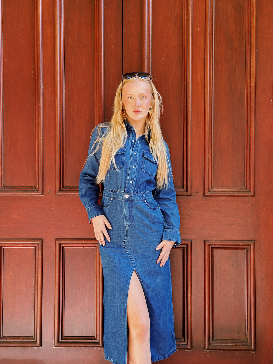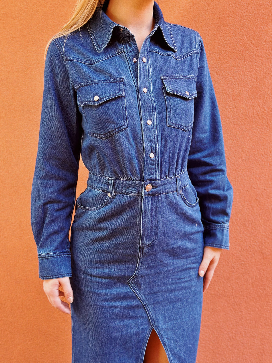 Elevate your wardrobe with our DAKODA dress. Crafted with a denim long-sleeve bodice, button-down maxi dress, this dress exudes effortless style. The center front slit adds a touch of femininity, while the skirt pockets provide both convenience and practicality. Perfect for any occasion, this dress will be a staple in your closet.