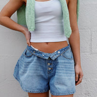 - Flare Denim Short w/ Adjustable Fold Over Waistband