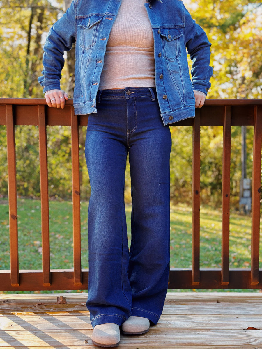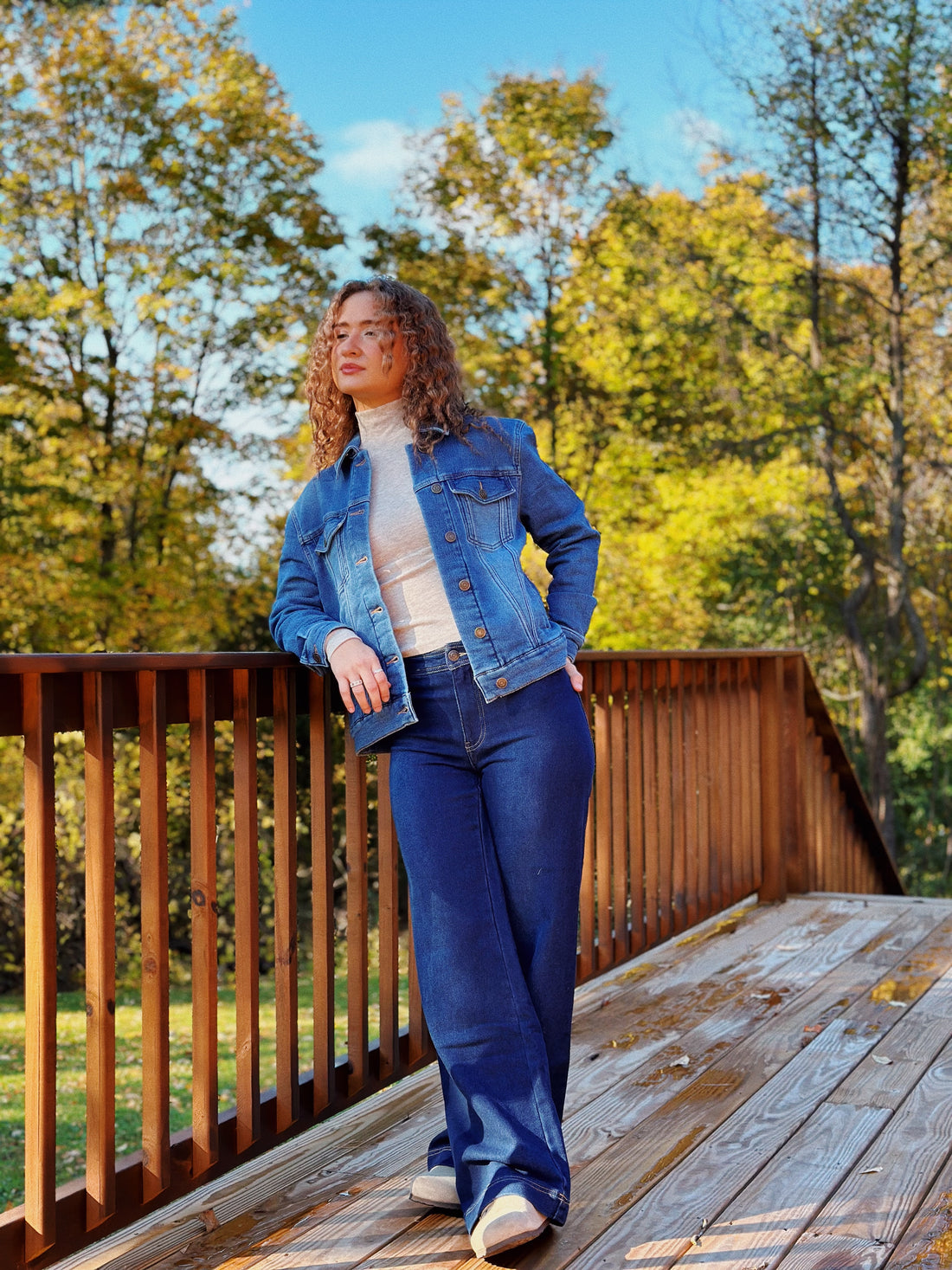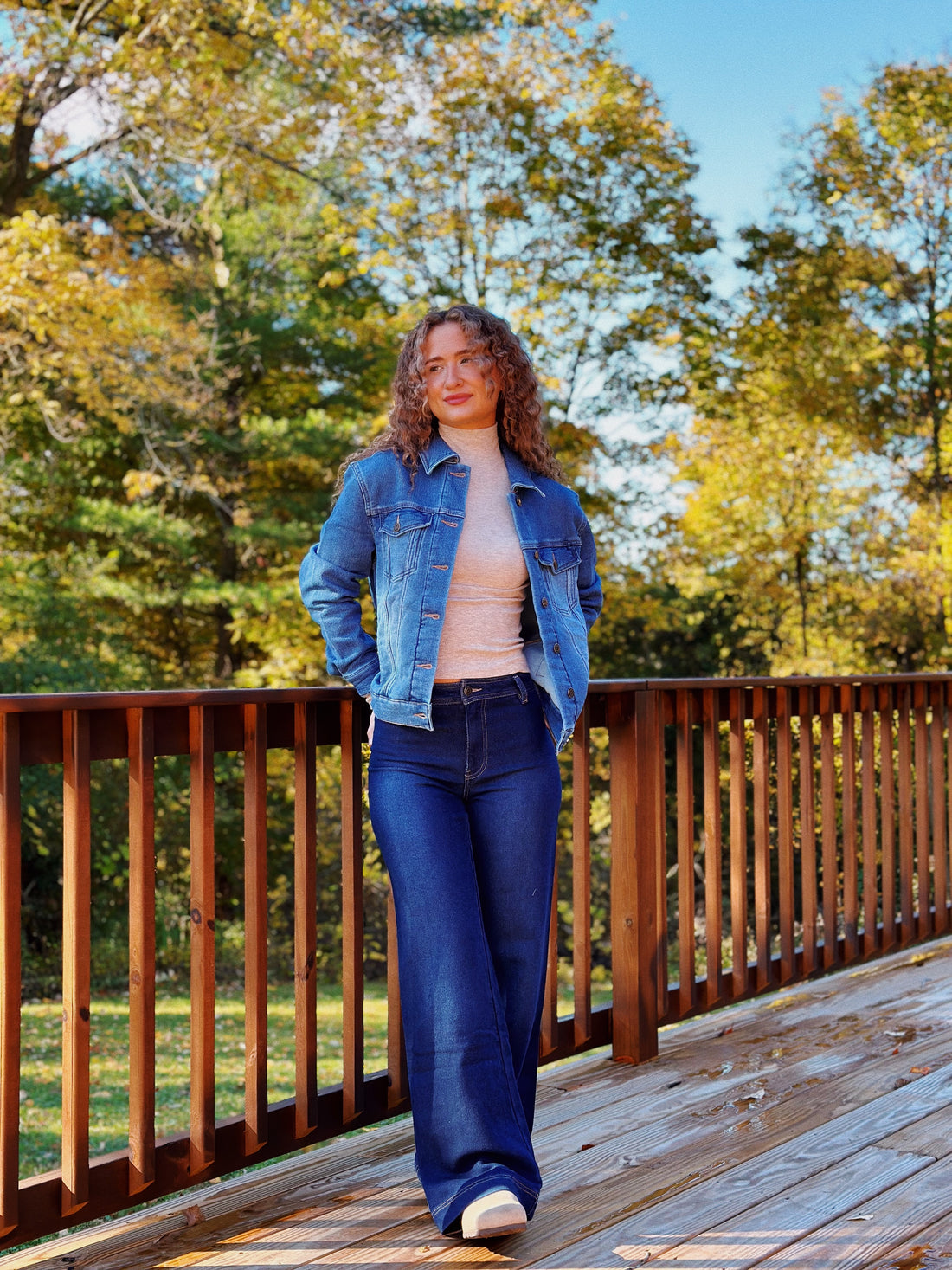 • We're excited to debut this chic mid-rise wide leg jean, crafted from premium heavyweight knit denim for a sophisticated look and durable feel. With patch pockets at the back, a structured waistband, and wide hem detail, these full-length jeans offer timeless style.