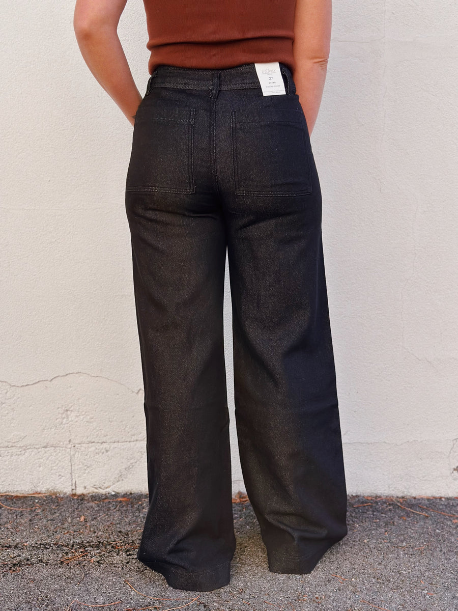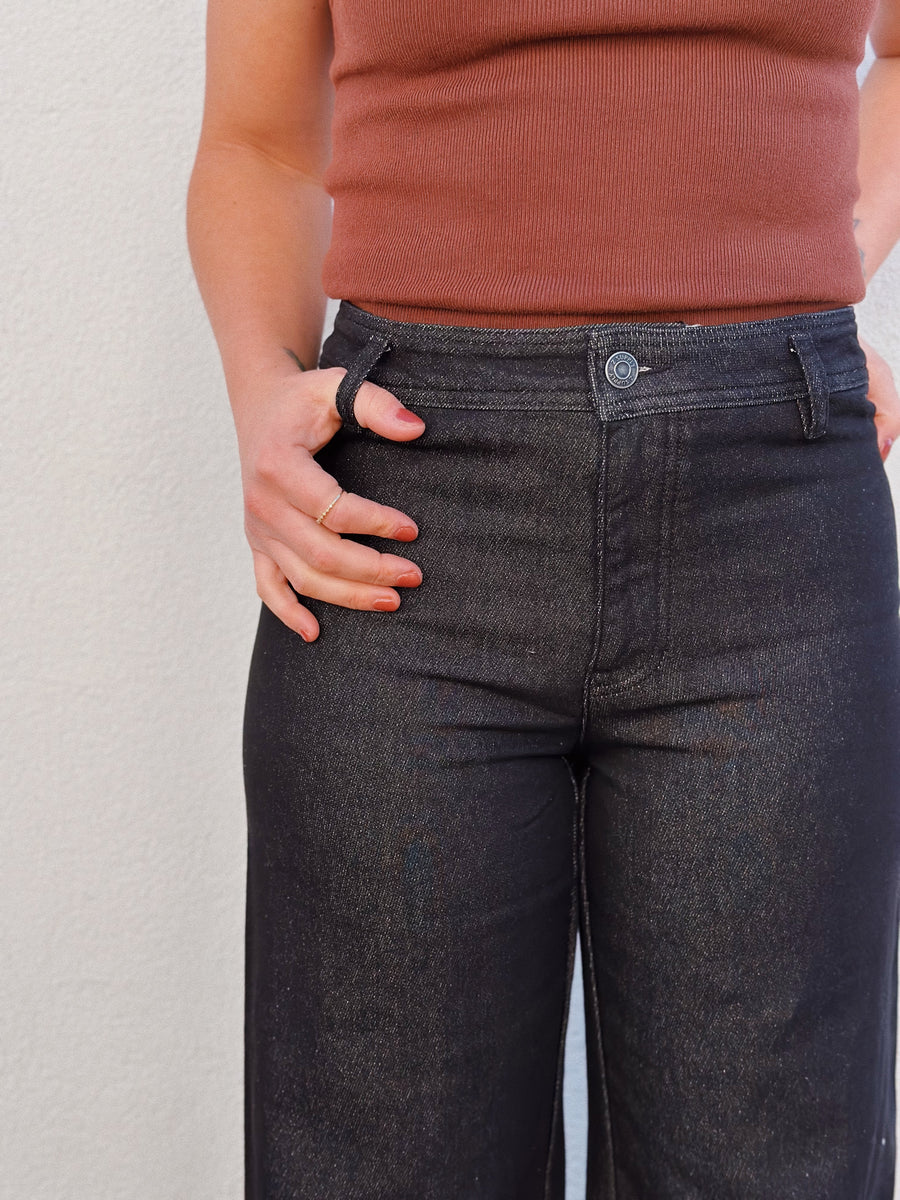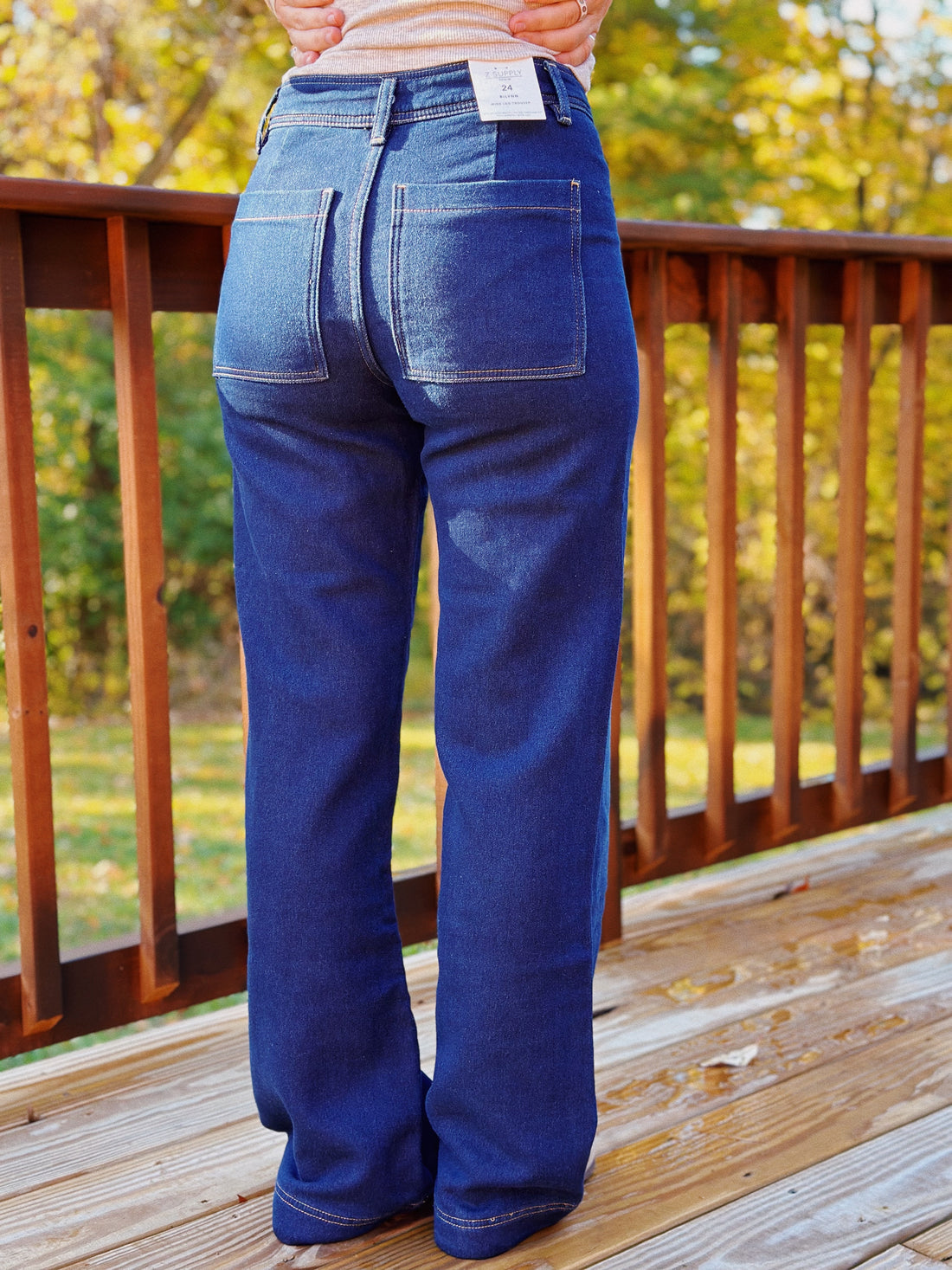 • We're excited to debut this chic mid-rise wide leg jean, crafted from premium heavyweight knit denim for a sophisticated look and durable feel. With patch pockets at the back, a structured waistband, and wide hem detail, these full-length jeans offer timeless style.